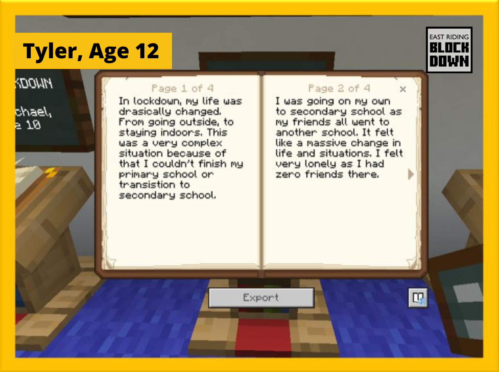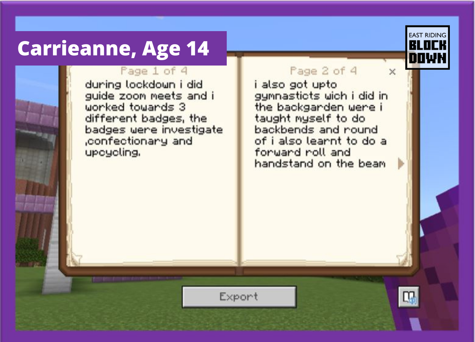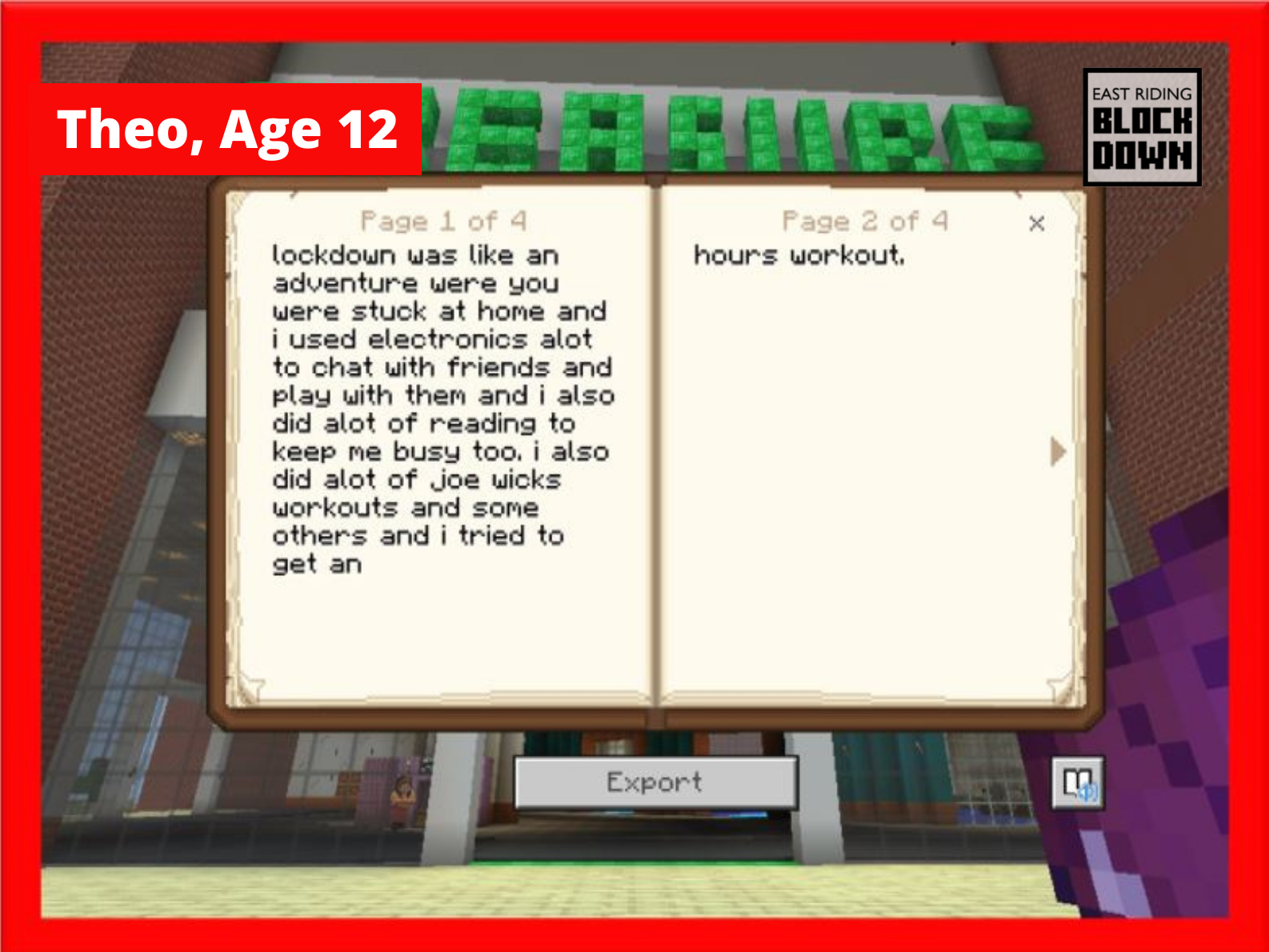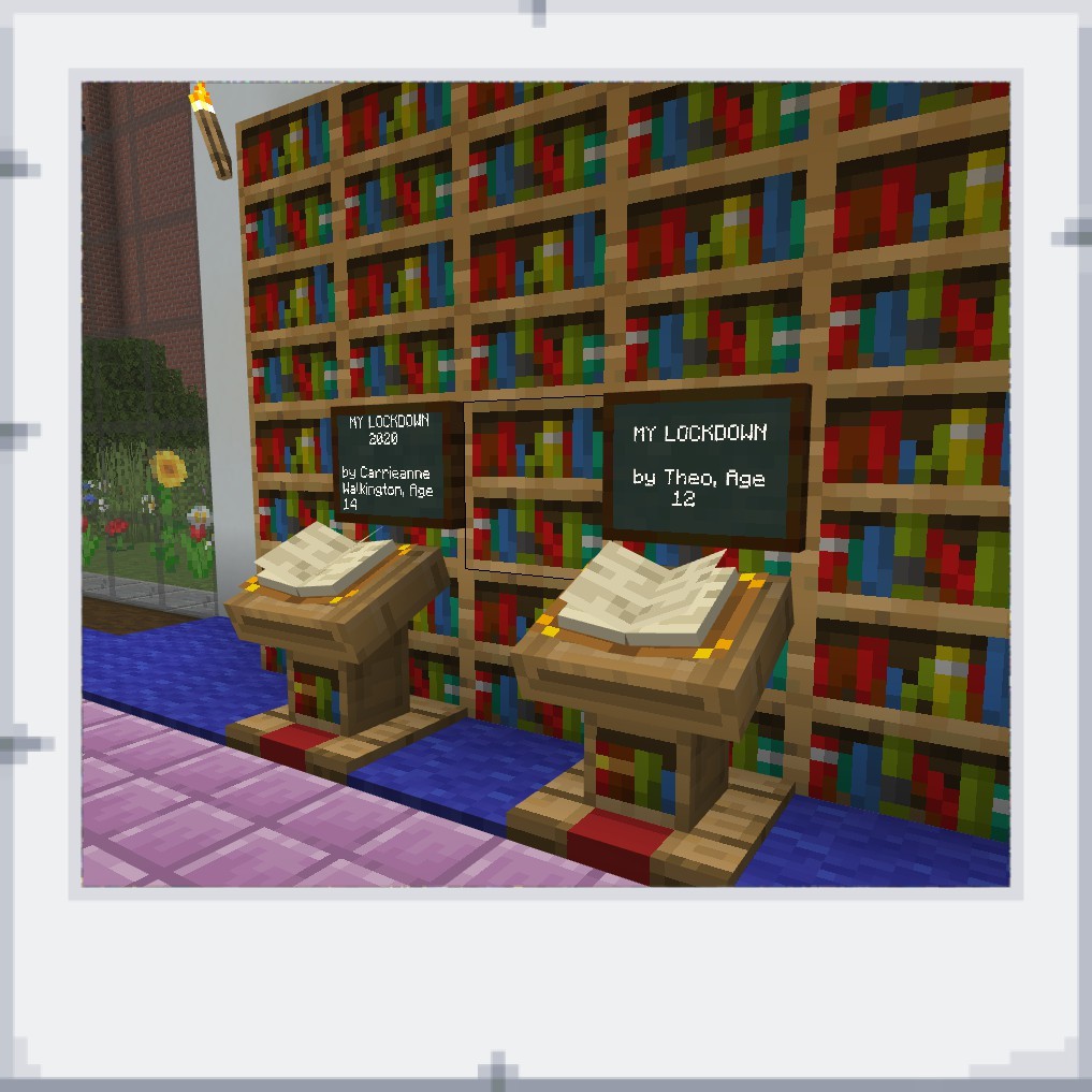 Despite the stormy weather in Bridlington, the events were well-attended in the junior section of the library. Our participants, Minecrafters both new and expert, built and documented their lockdown experiences on our Minecraft Education Edition version of the Archiverse map.